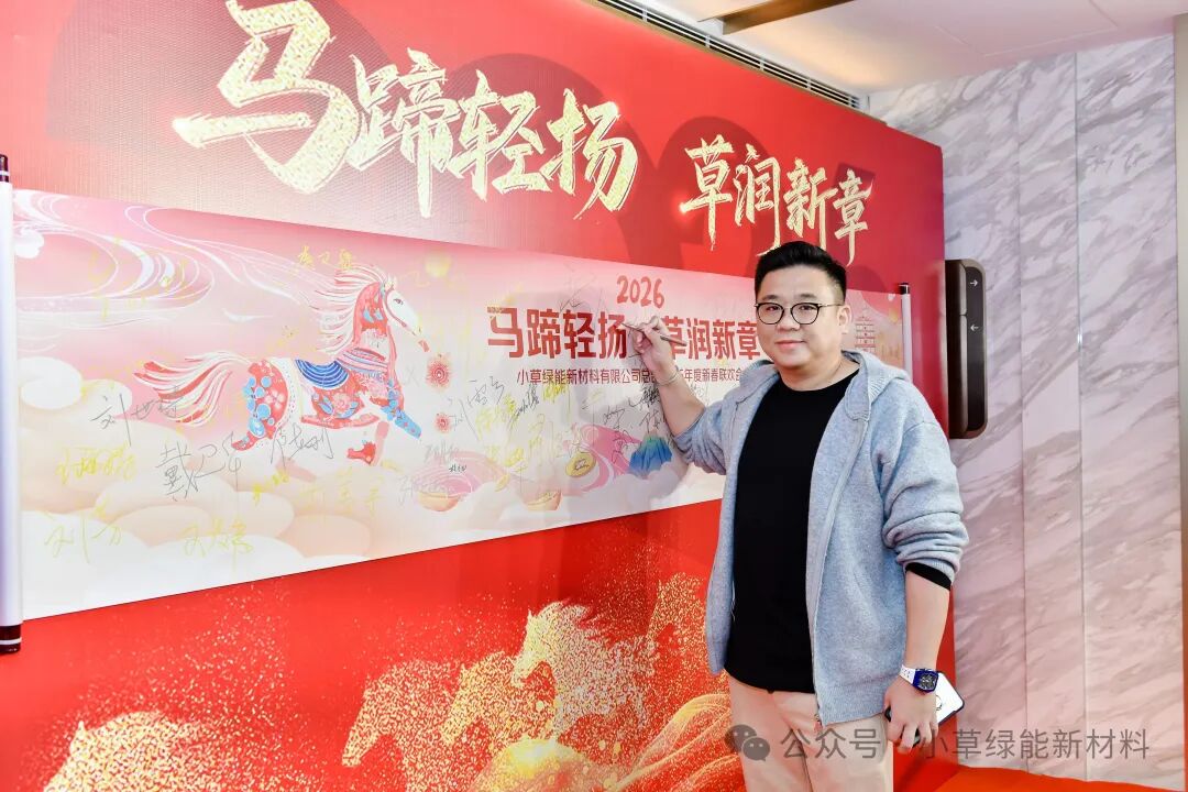 华灯初上,暖意融融。二楼签名墙前,公司领导与礼仪团队一同迎接各位同仁,合影留念,定格每一幕笑语欢颜。现场大屏循环播放的年度回顾短片,承载着过去一年小草绿能全体伙伴携手奋进的奋斗记忆,也映照出大家深耕可生物降解新材料领域、共赴绿色发展新程的共同期盼。